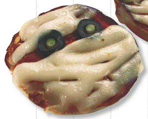 English Mummies– These yummy mummy pizzas make a quick and fun Halloween lunch or dinner. To create one, first spread a tablespoon of pizza sauce onto half of an English muffin (toast it first, if you like). Set olive slices in place for eyes and add round slices of green onion or bits of red or green pepper for pupils. Lay strips of cheese (we used a pulled-apart cheese stick) across the muffin for the mummy’s wrappings. Bake at 350° until the cheese is melted and the muffin is toasty, about 10 minutes.