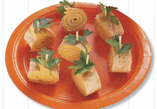 Pumpkin Roll-Ups- Here’s a wholesome snack to serve before the kids head out to trick-or-treat. Lay American cheese slices or spread cream cheese on sun-dried-tomato tortillas, then roll them up and cut them into 1-inch sections. Use a toothpick to secure each roll-up, topped with a sprig of cilantro or parsley.