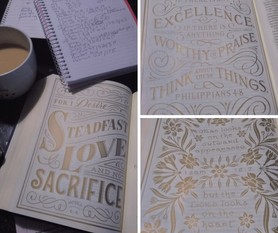 I’ve been using my bible a lot lately, I blame it on my love for God and my Small Group every week. Going through my little bible though meant writing everything I wanted to remember in a notebook even when I felt God was talking to me, only one problem with that….there are no spaces except the tiny ones on the side of my pages. Do you go through this too? I found the cure to that though when I was asked to take a peek at the new Illuminated Bible.